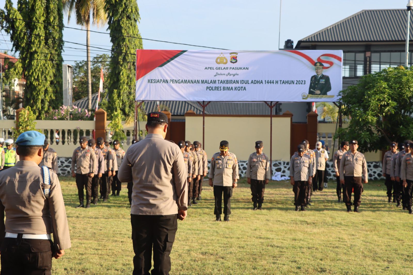Pengamanan malam takbiran itu, diawali apel gelar pasukan Rabu (28/6/2023) sore di Lapangan Presisi Lawata Mako Polres Bima Kota.