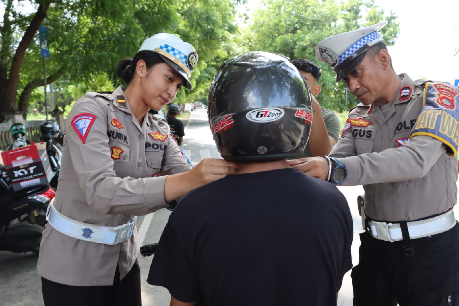Dipimpin KBO Lantas Polres Bima Ipda Heri Supriyanto didampingi Kanit Laka Ipda Nurul S.Tr.K., melaksanakan aksi Simpatik jelang Nataru 2024 yakni dengan membagikan Helm SNI kepada pengendara Roda dengan Gratis.