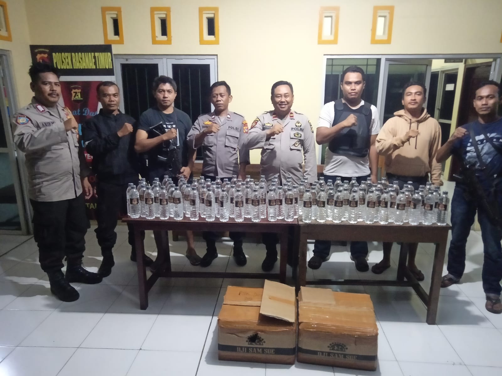 Setelah dilakukan pengeledahan dan pemeriksaan terhadap kendaraan minibus tersebut, ditemukan dua bungkusan kardus yang berisi miras oplosan jenis arak Bali. Setiap kardus berisikan 50 botol miras oplosan dengan total keseluruhan sebanyak 100 botol. Barang bukti berupa miras oplosan jenis arak Bali tersebut kemudian diamankan di Mapolsek Rasanae Timur.