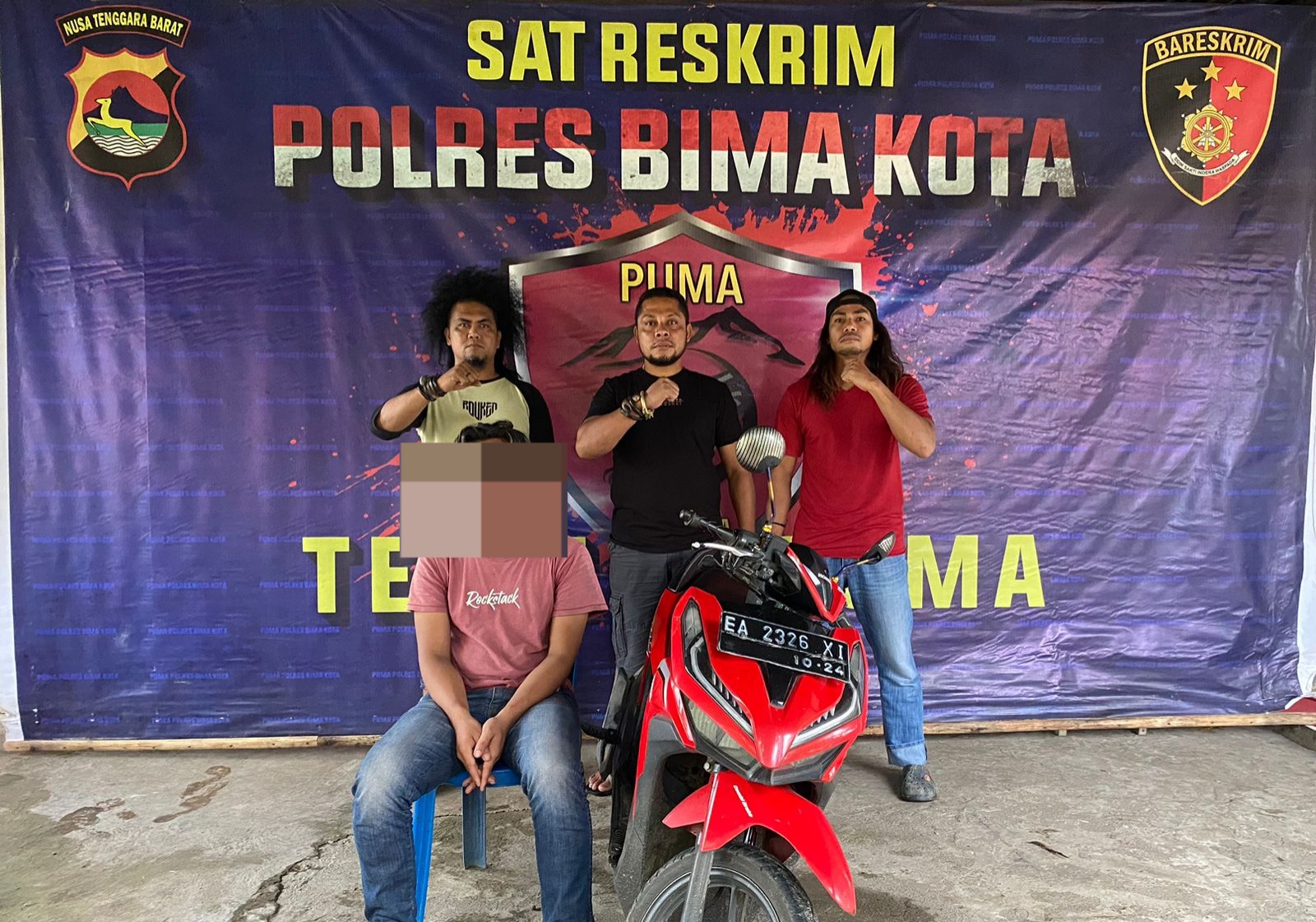Kapolres Bima Kota AKBP Yudha Pranata, melalui P.S Kasubseksi Pidm Sie Humas Aipda Nasrun, menjelaskan bahwa terduga pelaku yang berhasil diamankan adalah AE (23 tahun) Barang bukti yang berhasil diamankan adalah satu unit SPM Vario warna merah dengan nomor identitas MH1JM4112KK492426 dan nomor mesin JN41E1491910.