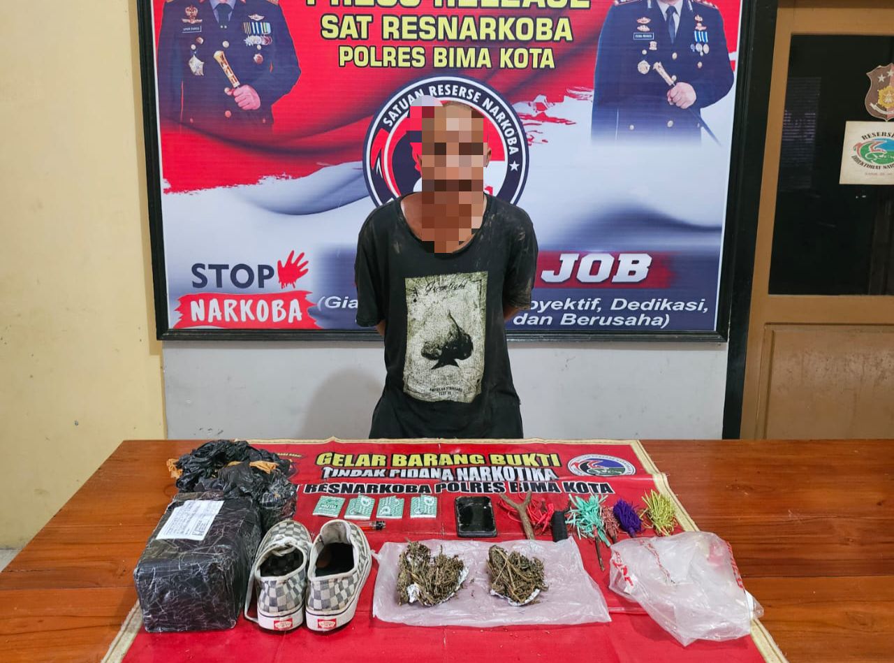 Kota Bima, NTB (30/3) – Tim Opsnal Sat Resnarkoba Polres Bima Kota berhasil mengungkap kasus penyalahgunaan narkoba di wilayah hukumnya. Seorang pengedar ganja asal Kabupaten Bima, yang diketahui bernama HS (31), berhasil diringkus bersama barang bukti seberat 50 gram ganja kering siap edar.