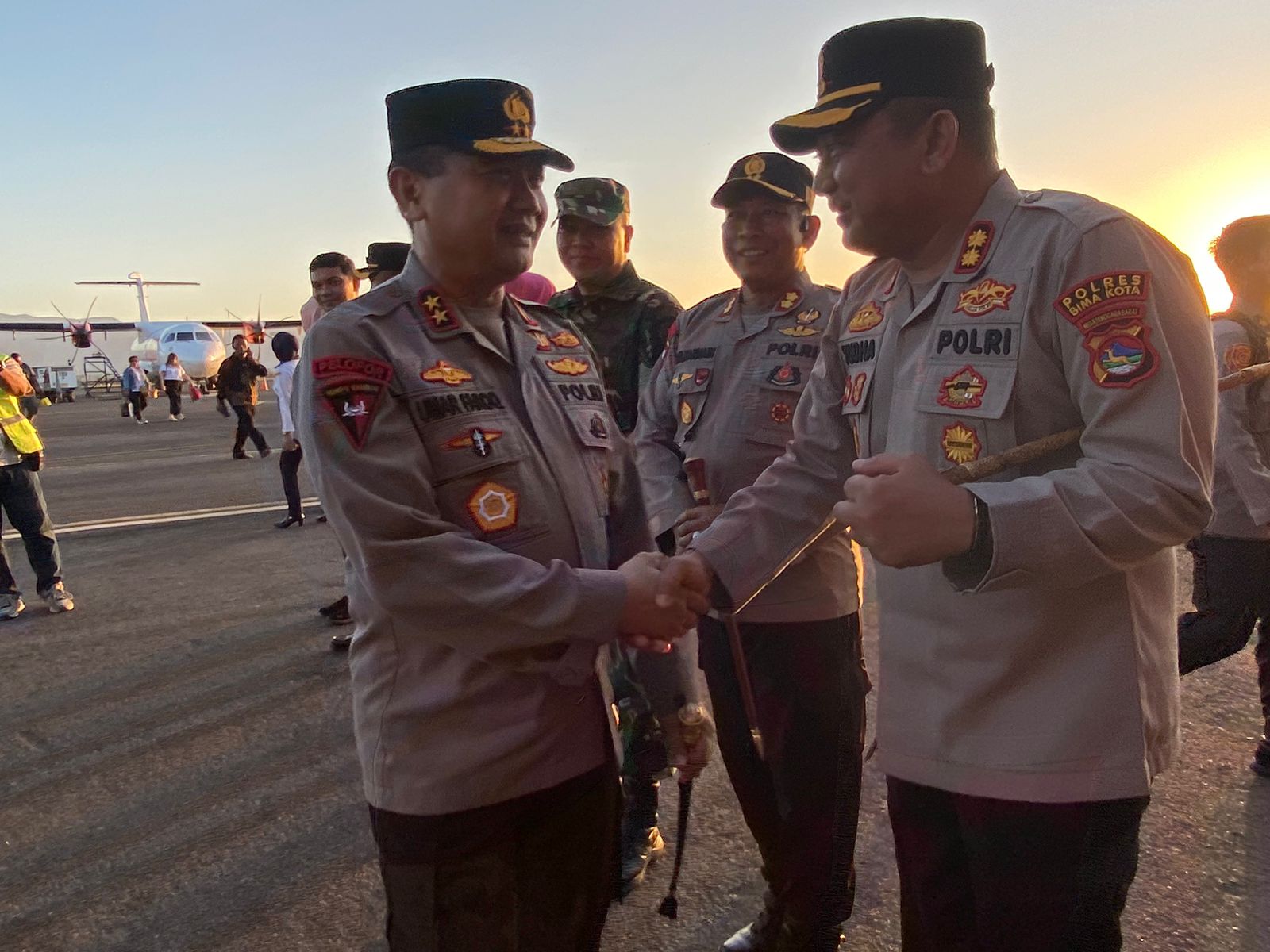 Kota Bima, NTB (5/7) – Kapolres Bima Kota AKBP Yudha Pratama S.I.K., S.H., menyambut kedatangan Kepala Kepolisian Daerah Nusa Tenggara Barat (NTB), Irjen Pol Drs. Raden Umar Faroq SH., M.HUM., di Bandara Sultan Muhammad Salahuddin Bima. Kapolda NTB dan rombongan tiba dengan menumpangi Pesawat Udara Wings Air rute Denpasar-Bima pada Kamis (04/07/24) sekitar pukul 17.45 WITA.