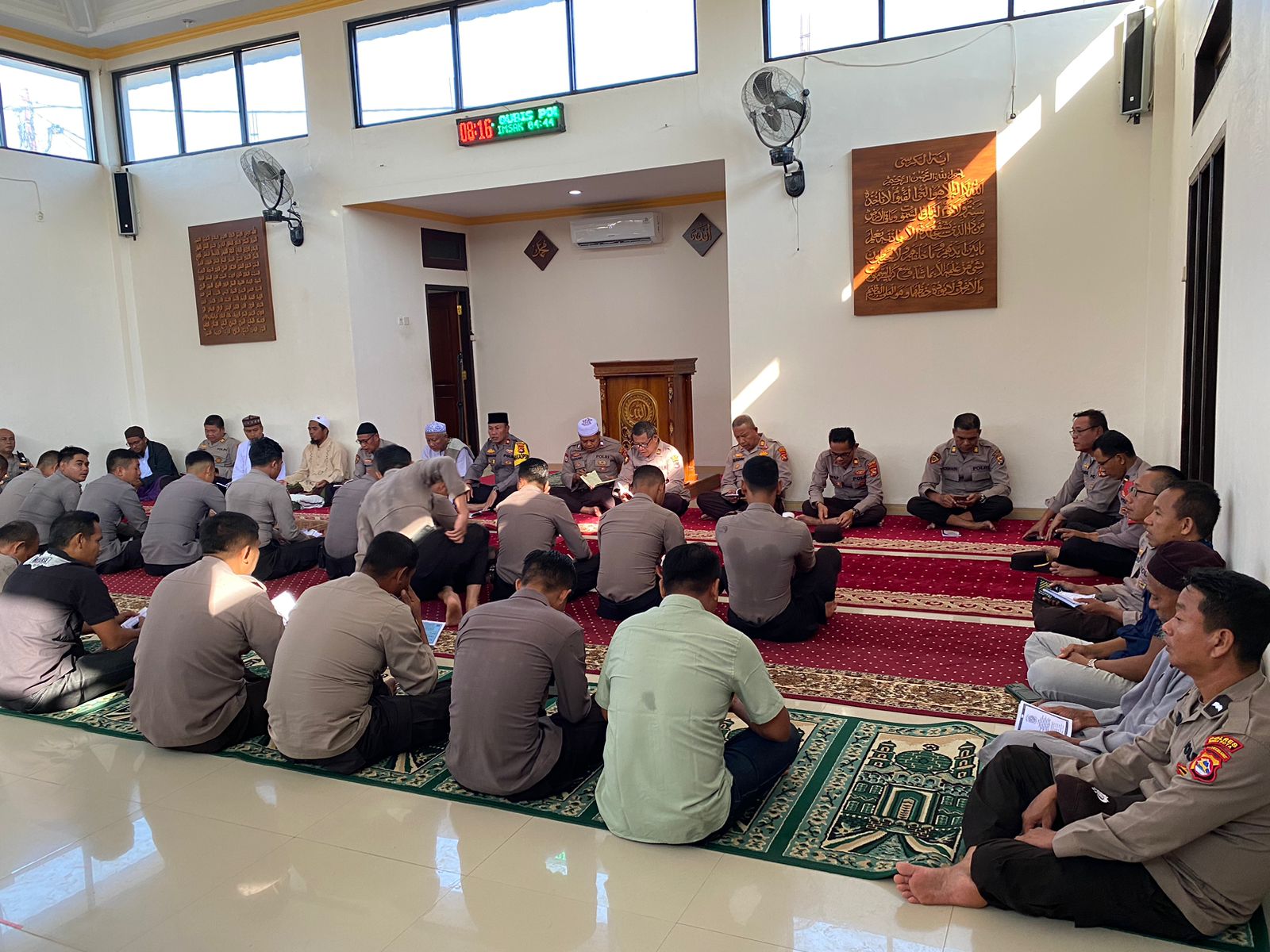 Setelah seluruh personel Polri dan ASN memasuki Masjid, acara dimulai dengan pembacaan bersama Surat Yasin yang dilakukan dengan penuh khidmat. Kegiatan Binrohtal ini merupakan bagian dari upaya Polres Bima Kota untuk membentuk karakter personel yang tidak hanya profesional dalam menjalankan tugas, tetapi juga memiliki integritas moral dan spiritual yang kuat.
