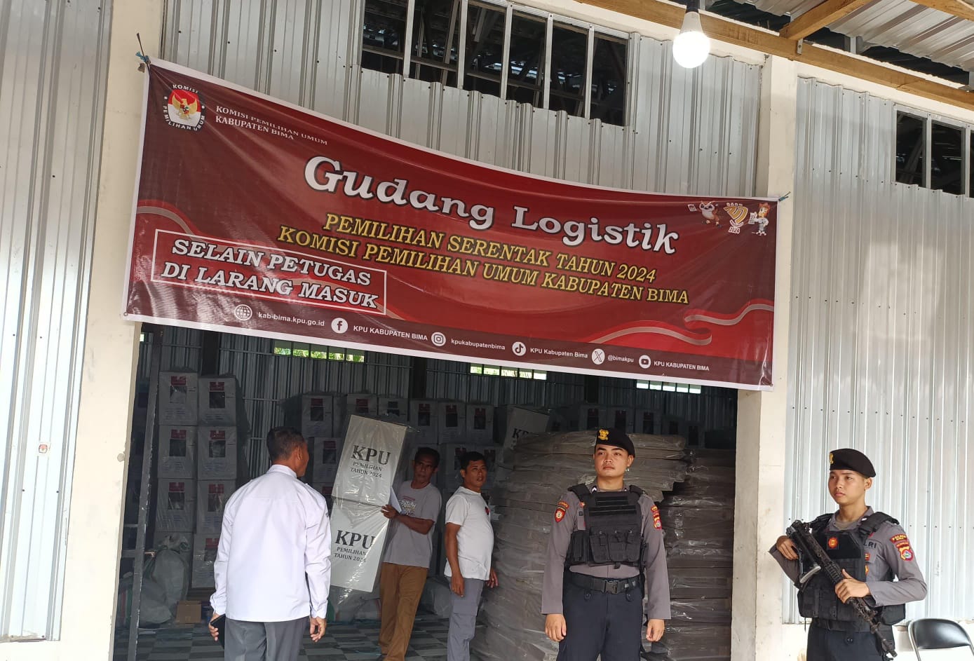 Bima, NTB (27/11) – Dalam rangka menjamin keamanan pendistribusian logistik KPU menuju kecamatan yang ada diwilayah Kabupaten Bima Satgas Preventif OMP Polres Bima Polda NTB melaksanakan pengamanan di gudang logistik KPU Kabupaten Bima.