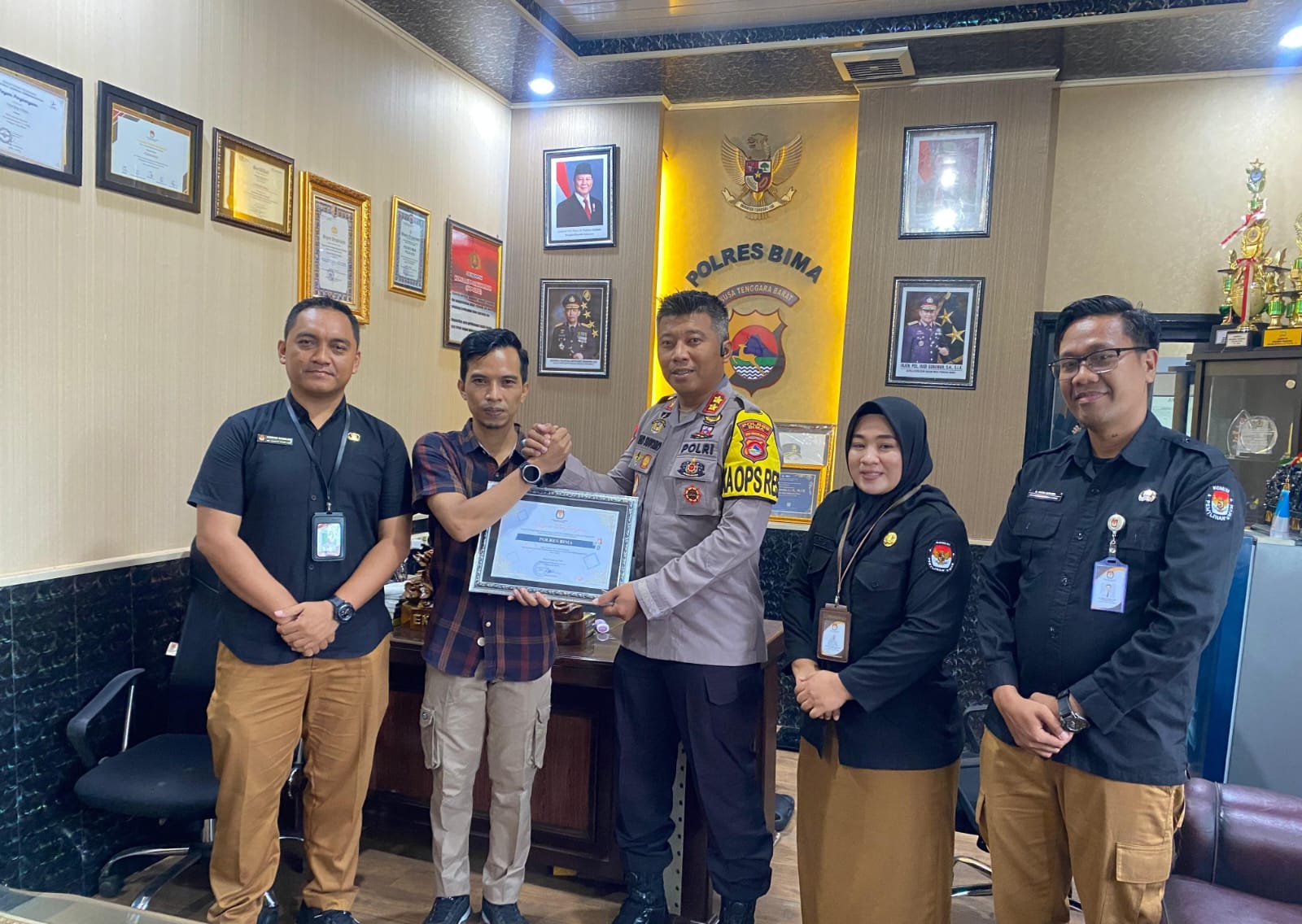 Ketua KPU Kabupaten Bima Ady Supriadin memberikan apresiasi dalam bentuk piagam penghargaan, yang diserahkannya langsung kepada Kapolres Bima AKBP Eko S.I.K., M.I.K., diruang kerja Kapolres Bima Rabu (12/02/25).