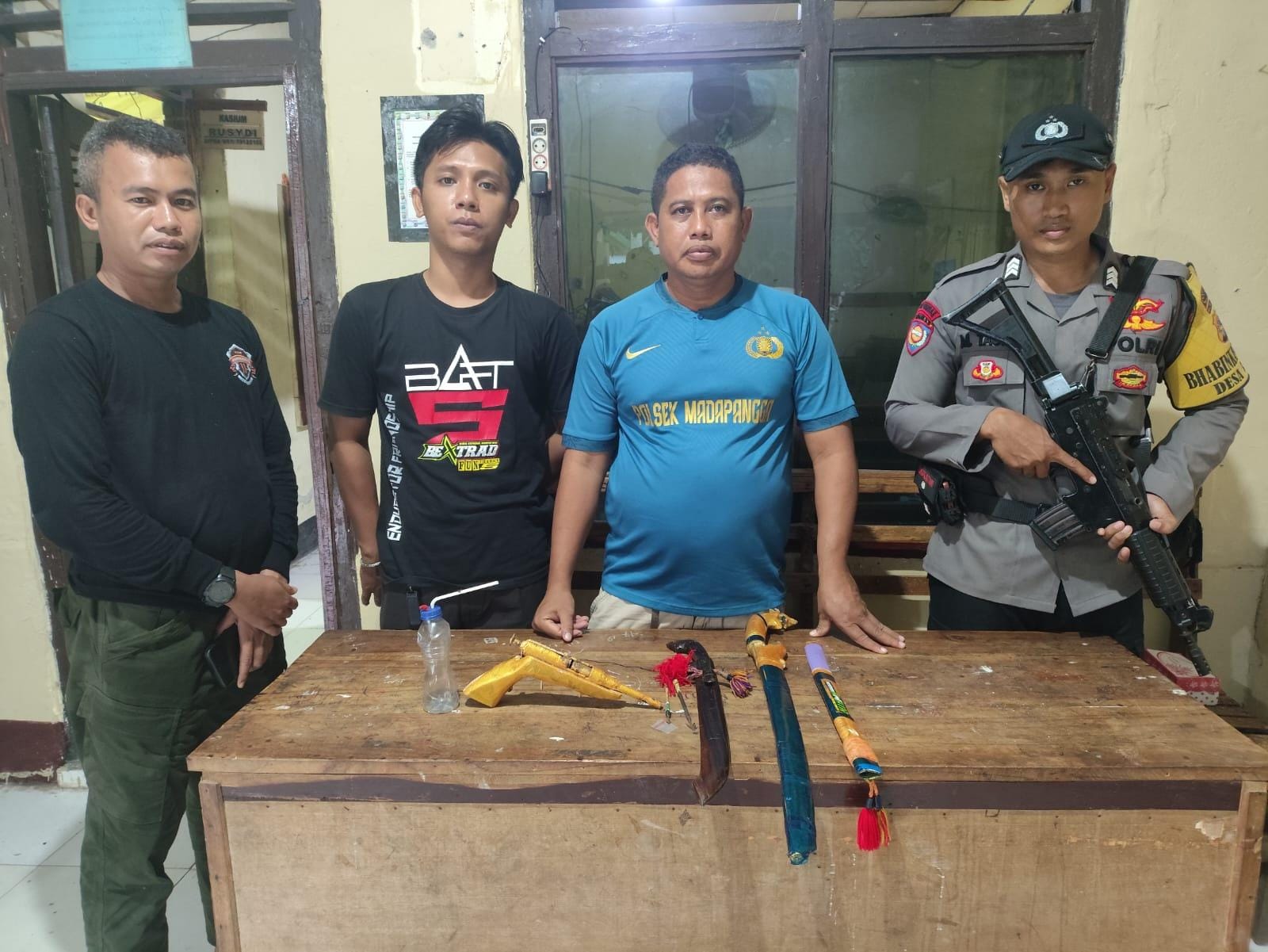 Kapolsek meneruskan, tiba di TKP/ dan saat petugas mendekati terduga pelaku bersiap untuk untuk melakukan perlawanan dengan memegang sebilah Parang dan Tombak.